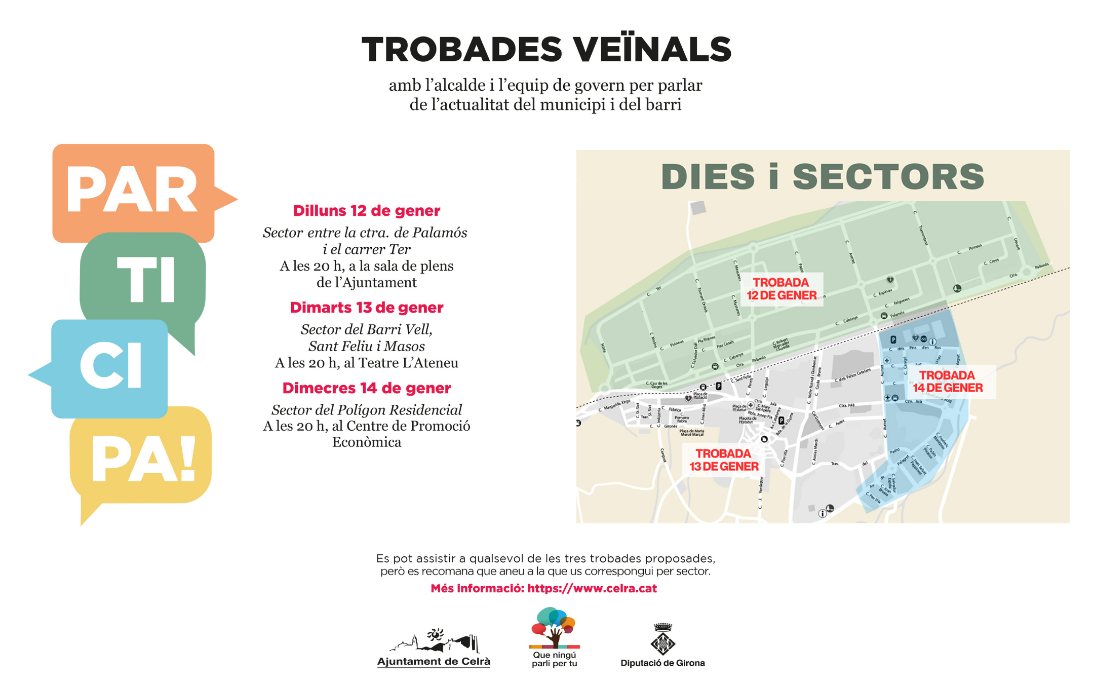 🔔 La setmana entrant tindran lloc tres trobades veïnals en què l'alcalde i els membres de l'equip de govern municipal es reuniran amb la ciutadania per parlar de l'actualitat del municipi i del barri.