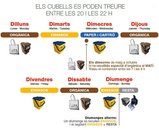 - Diumenges: envasos (cubell groc-blau) / envasos (cubell groc-blau) + rebuig (cubell gris o bossa especial), de manera alternada